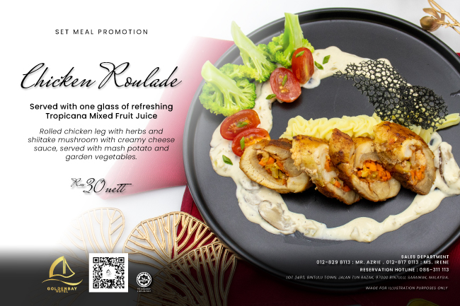 Indulge in our Chicken Roulade — tender chicken leg rolled with herbs & shiitake, baked to perfection, and served in a creamy cheese sauce.